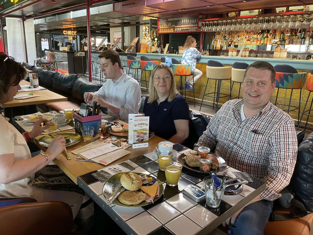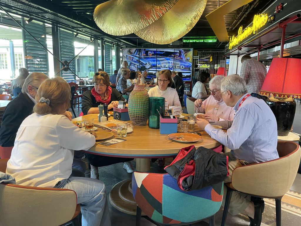 Weiter ging die Fahrt über Felder, Wiesen und durch reichlich Wald zum Bauernhofcafé Binnenheide bei Winnekendonk zum Mittagessen. In einem Bauernhof haben die Eigentümer aus den alten Schweinestallungen gemütliche Gasträume mit Wohnzimmeratmosphäre geschaffen. Mit vielen Sinnsprüchen auf Tafeln und einer liebevollen Dekoration auf Tisch und an den Wänden konnten die Schnauferlbrüder und Gäste ein leckeres Mahl einnehmen, zur Auswahl gab es Himmel und Erde oder Rösti mit Räucherlachs. Die Kuchenportionen haben ein erhebliches Ausmaß, alles einschließlich des leckeren Brots ist hausgemacht. Der krönende Abschluss war aber nicht der Kaffee sondern ein vom Wirt in eigener Person vorgetragenes, ja vorgeschmettertes „Besame mucho“, mit dem er Renate Klein zum großen Vergnügen der Runde besang.