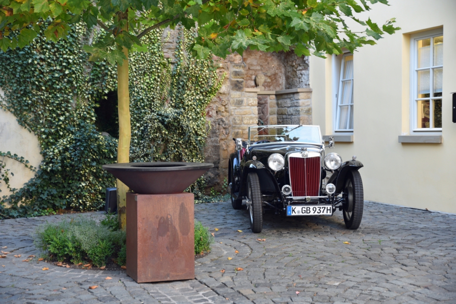 „Dä Präsidöres hät doosch“ lautete das Motto der ersten Sonderprüfung am Samstag, bei der die Geschicklichkeit im Umgang mit gefüllten Sektgläsern auf einer Holperstrecke geprüft wurde… Prüfungsgelände waren natürlich die hubbeligen Straßen im Ortskern. Nach einer wunderbaren Fahrt über die Höhen und durch die Täler der Pfalz, erreichten die Teilnehmer das Naheland zur Mittagszeit. Im Weingut Hermannshöhe, mitten in den herrlich eingefärbten Weinbergen und hoch über der Nahe gelegen, warteten ein Empfang, eine kleine Weinprobe und ein deftiges Essen. Quer durch die Weinberge und entlang der Nahe und dem Glan, führte das Roadbook zur Kaffee- und Kuchenpause in das Weingut Klostermühle unterhalb der Klosterruine „Disibodenberg“. Hier hat die heilige Hildegard von Bingen einen Teil ihres Lebens verbracht. Schließlich fand der wunderschöne Tag seinen Ausklang mit dem festlichen Abend im Gewölbe des Hotel Meisenheimer Hof.