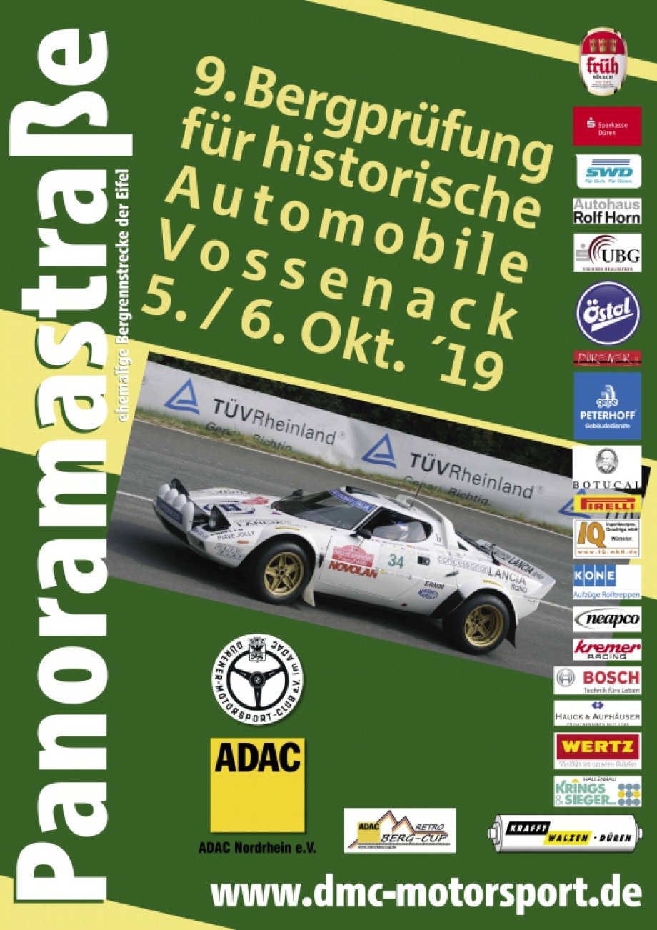 Die 9. Auflage der "Bergprüfung Vossenack" findet in 2019 am 05. und 06. Oktober statt. Informationen und die Ausschreibung wird man ab Frühjahr 2019 auf der Webeseite des Veranstalters, dem Dürener Motorsport Club, kurz DMC, abrufen können: